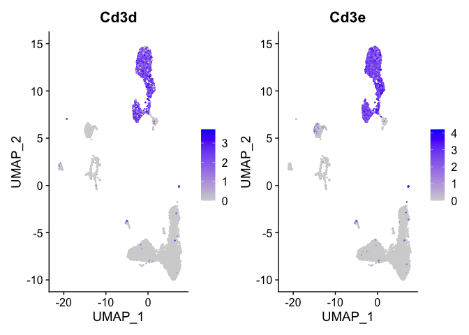 ```r t_cells <- c("1","5","6") ``` Lets look at T-cell and B-cell markers ```r t_cell_markers <- c("Cd3d","Cd3e") FeaturePlot(s_balbc_pbmc, features = t_cell_markers) ``` ![](/2020-August-Advanced-scRNAseq/data_analysis/VDJ_Analysis_files/figure-html/unnamed-chunk-13-1.png) ```r table(!is.na(s_balbc_pbmc$t_clonotype_id),s_balbc_pbmc$seurat_clusters) ```