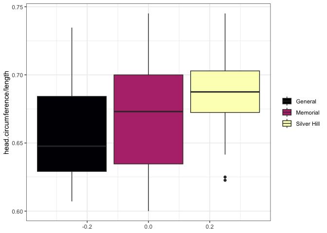 What is the ratio of head circumference to length for births at each of the hospitals? Box plot version: