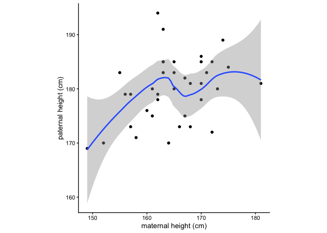 labs(x = "maternal height (cm)", y = "paternal height (cm)") +
