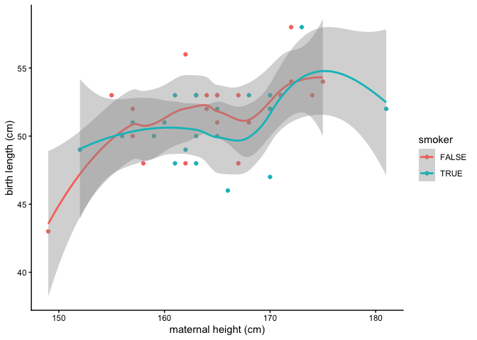 labs(x = "maternal height (cm)", y = "birth length (cm)") +