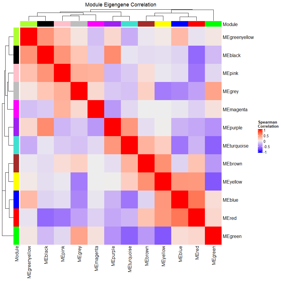 Let’s take a look at the correlations among the modules by using the module eigengenes. We use a Spearman (nonparametric) correlation.