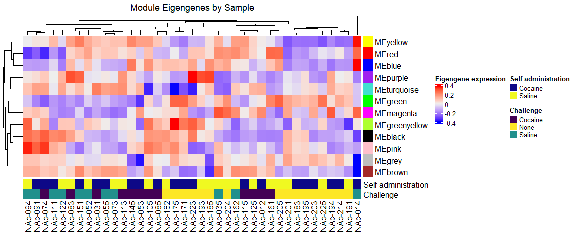 Let’s take a look at samples at this reduced dimension using the module eigengenes. We can plot a heatmap of the eigengenes by samples exactly as we would plot genes by samples for the original data.