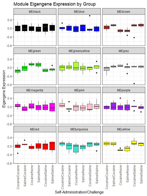 scale_fill_manual(breaks = colnames(MEs), values = gsub("ME", "", colnames(MEs))) + labs(x = "Self-Administration/Challenge", y = "Eigengene Expression", title = "Module Eigengene Expression by Group") +
