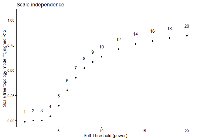 sft <- pickSoftThreshold(expr, dataIsExpr = T, networkType = "signed", corFnc = "bicor", RsquaredCut = 0.8)