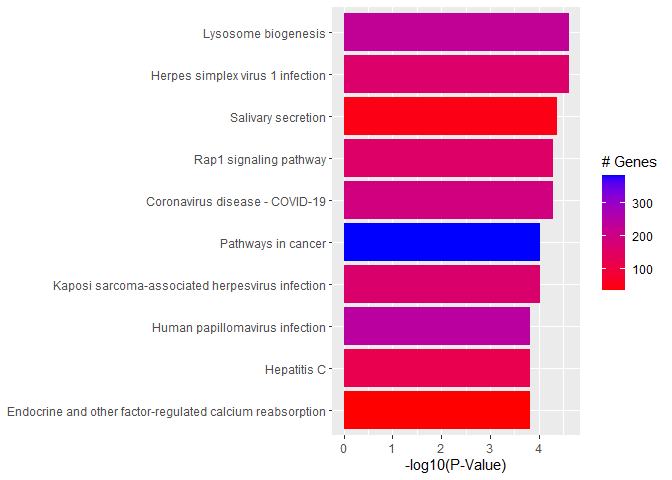 ggplot(plotdat, aes(x = -log10(p.adjust), y = reorder(nice.name, -log10(p.adjust)), fill = setSize)) + geom_bar(stat = "identity") + labs(x = "-log10(P-Value)", y = NULL, fill = "# Genes") + scale_fill_gradient(low = "red", high = "blue")
