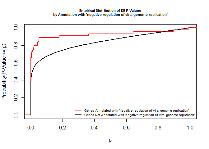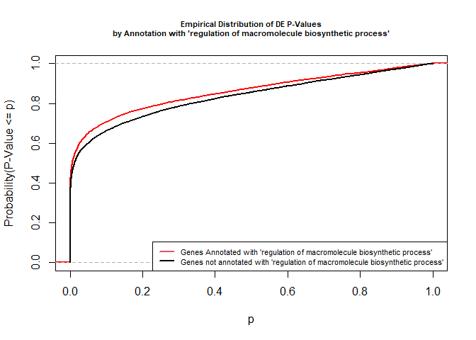 1. topGO Example Using Kolmogorov-Smirnov Testing Our first example uses Kolmogorov-Smirnov Testing for enrichment testing of our mouse DE results, with GO annotation obtained from the Bioconductor database org.Mm.eg.db.